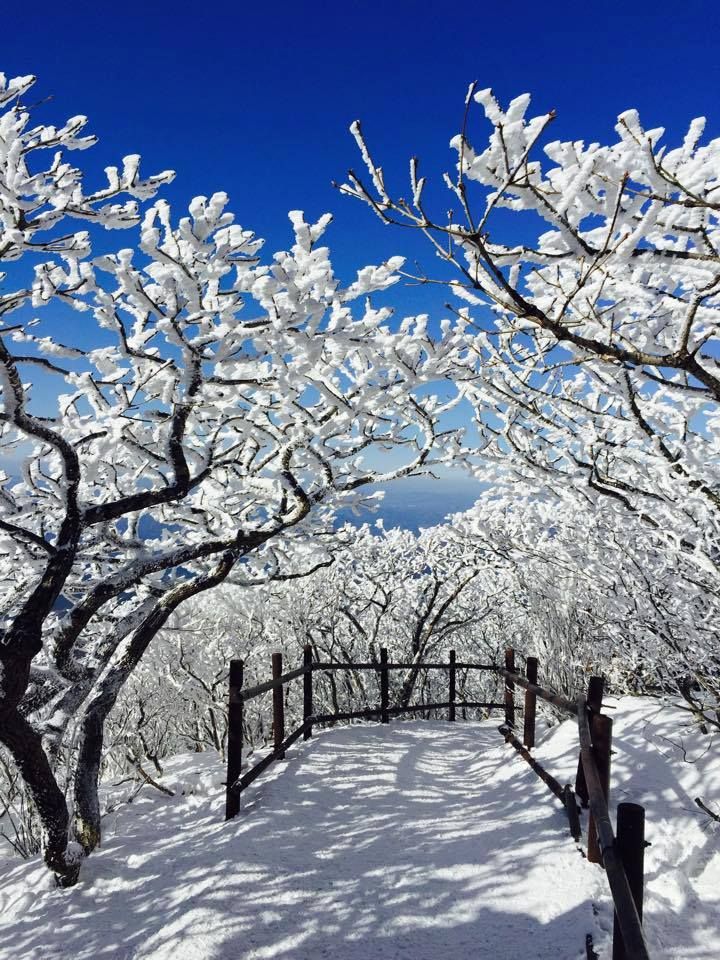 덕유산은 곤돌라를 이용하면 정상 근처까지 편하게 오를 수 있어 겨울철 인기 있는 산행지입니다. 설천봉에서 향적봉까지 이어지는 능선은 눈꽃 터널로 유명합니다.