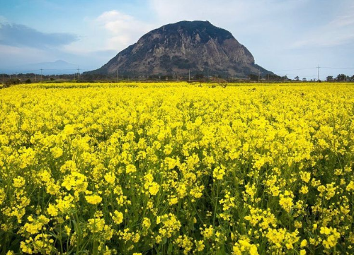 제주에서 가장 인기 있는 유채꽃 명소! 성산일출봉을 배경으로 펼쳐지는 노란 유채꽃밭에서 인생 사진 남겨보세요.