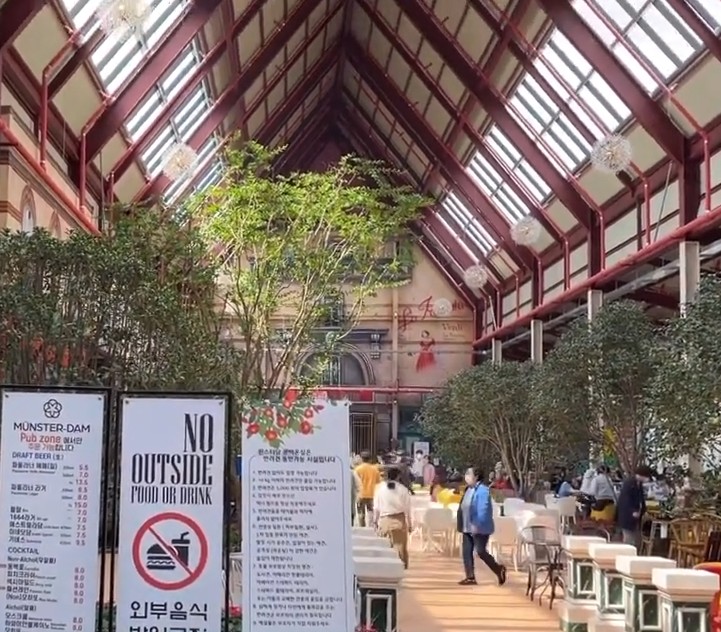 뮌스터담은 단순한 수영장이 아닙니다. 유럽풍 광장 콘셉트의 공간에서 카페, 레스토랑, 펍, 베이커리, 공연장이 함께 운영됩니다.
